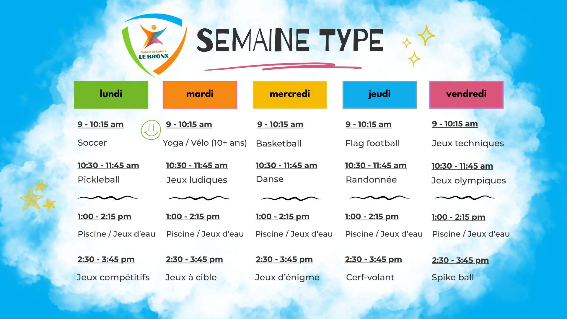 Situé au cœur du Bronx à ville LaSalle, notre camp d'été vise à offrir aux familles du quartier un espace accessible où les enfants peuvent vivre un été actif, enrichissant et rempli de découvertes.